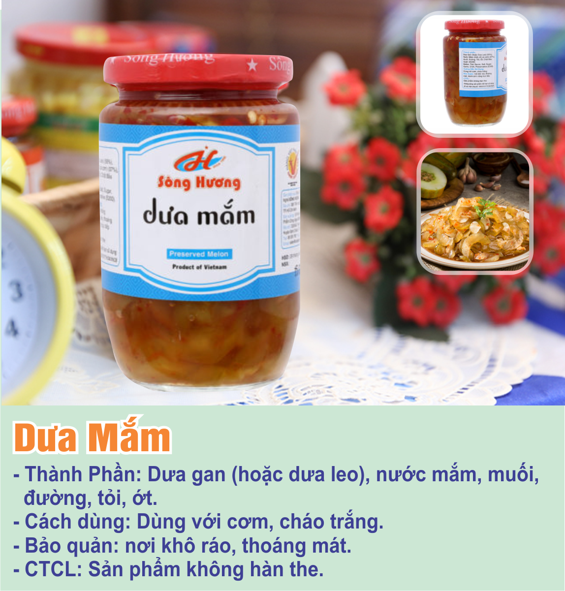 Dưa mắm là một trong những món ăn kèm truyền thống của người Việt. Dưa mắm có thành phần rau củ bao gồm củ cải, đu đủ, củ kiệu, cà rốt được chọn lựa và sơ chế kỹ lưỡng. Sản phẩm được ướp gia vị và không có chứa hàn the, an toàn cho sức khỏe người dùng. Dưa mắm có vị cay, giòn, màu ớt đỏ, phù hợp dùng trong bữa ăn hàng ngày hay ăn kèm với bánh chưng, bánh tét hay các loại thịt, hải sản để giảm độ béo. Sản phẩm được sản xuất trên dây truyền đạt tiêu chuẩn ISO 22000:2018 đóng dưới dạng hũ thủy tinh kín đáo đảm bảo an toàn thực phẩm, dễ dàng sử dụng và bảo quản. Dưa Mắm Sông Hương được người tiêu dùng bình chọn là hàng Việt Nam chất lượng cao.